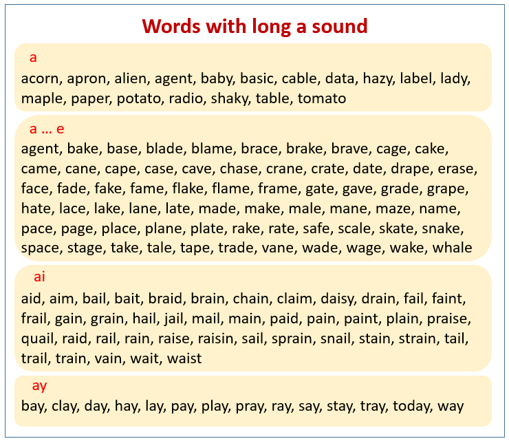 Následující schéma ukazuje některé příklady slov, která mají dlouhou hlásku a. Projděte si další příklady a písničky, které vám pomohou naučit se vyslovovat slova začínající dlouhou samohláskou a.