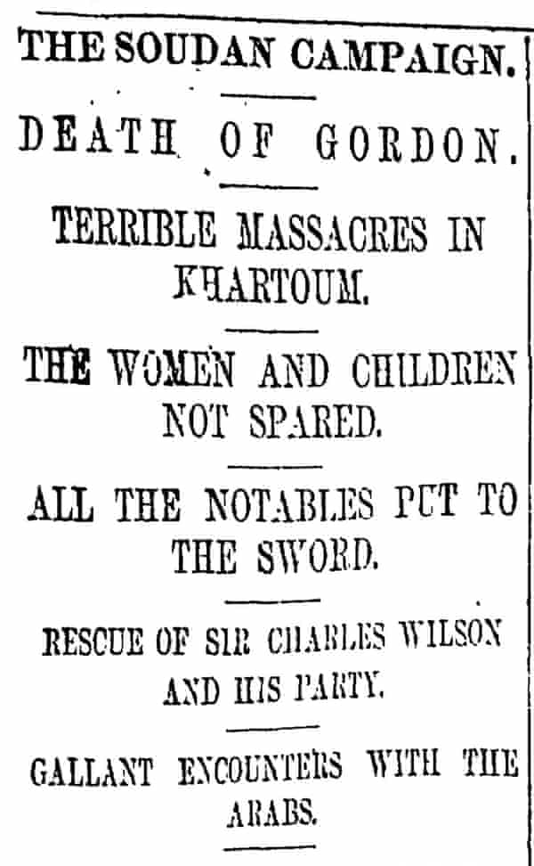 Din păcate, nu mai poate exista acum nici o îndoială că generalul Gordon a fost printre cei masacrați când Khartoum a căzut în mâinile rebelilor. Băștinașii care au scăpat îl descriu ca fiind ucis în timp ce ieșea din casa sa pentru a-și aduna trupele fidele, care au fost luate prin surprindere. Aceștia au fost reduși la un singur om. Timp de câteva ore, cea mai bună parte a orașului a fost scena unui masacru fără milă. Nici măcar femeile și copiii nu au fost cruțați. Toți notabilii, cu excepția pașilor trădători și a adepților lor, au fost trecuți prin sabie.